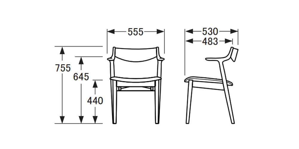 曲木加工を施した背板、複雑な曲面の形成からなる有機的な肘形状など、浜本工芸の職人の高い技術を活かしたクラフトマンシップを感じるダイニングシリーズです。背は一枚板に曲木加工を施しており、背当たりのよい曲線が魅力です。
