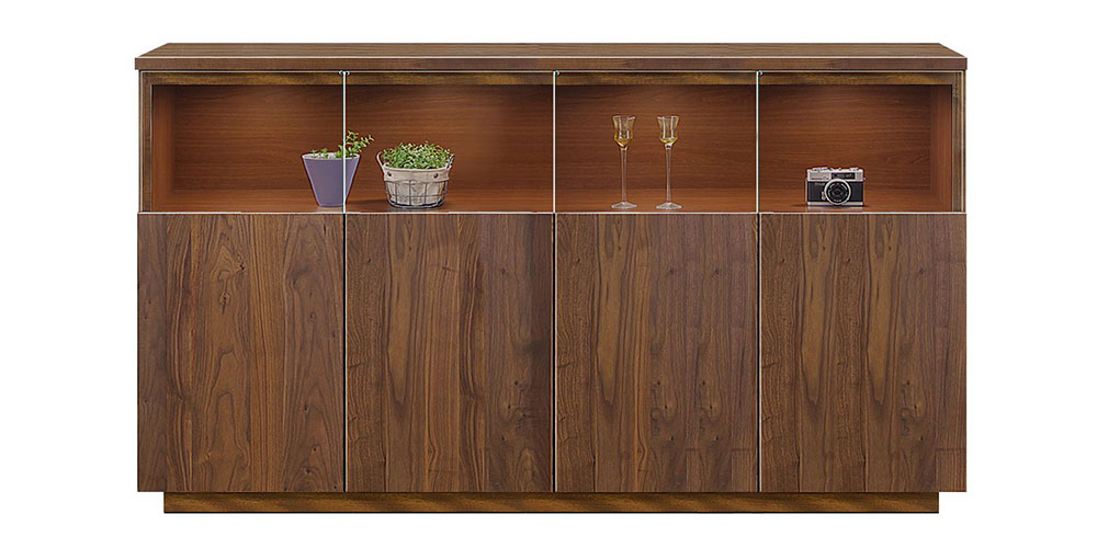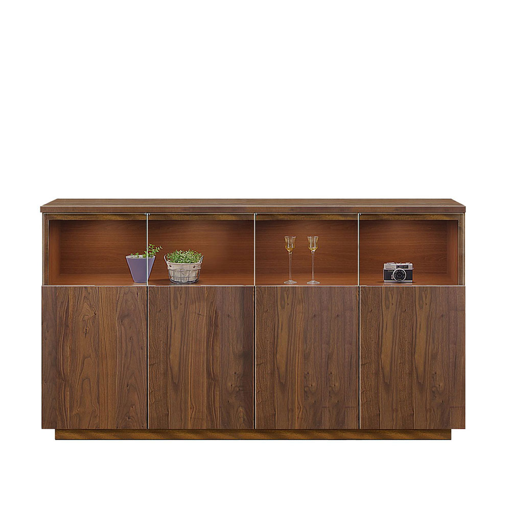 LED照明付きのガラス面があり、隠す収納と飾る収納を両立したサイドボードです。※画像はWNウォールナット材のイメージです。小物類は付属いたしません。