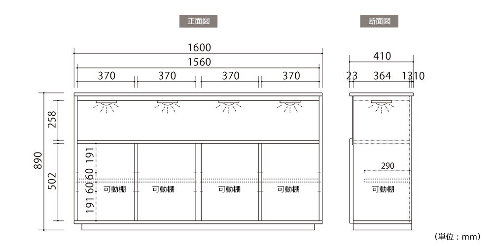可動棚板サイズ:幅370x奥行290x厚み20mm(60mmピッチ・3段階)