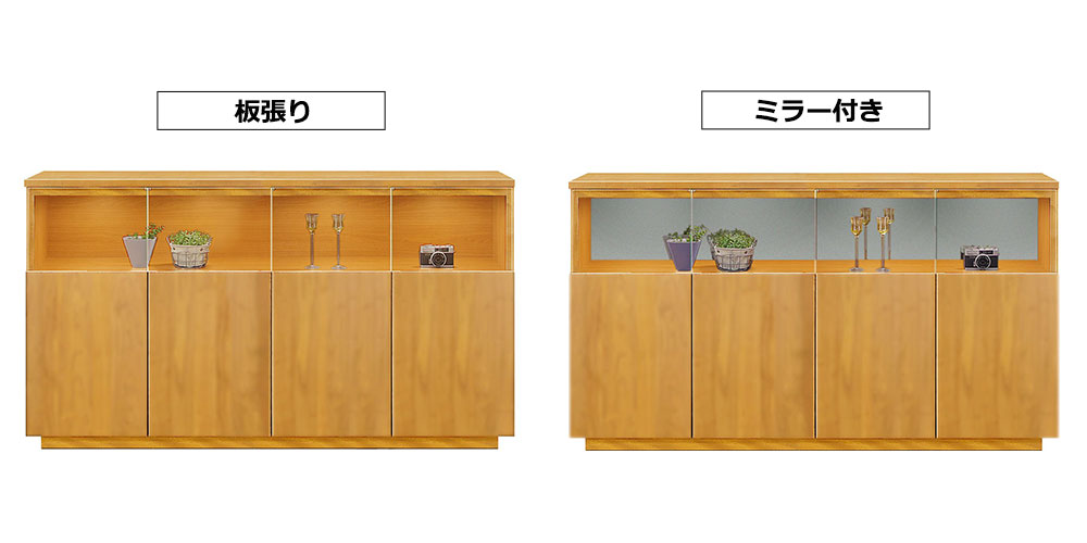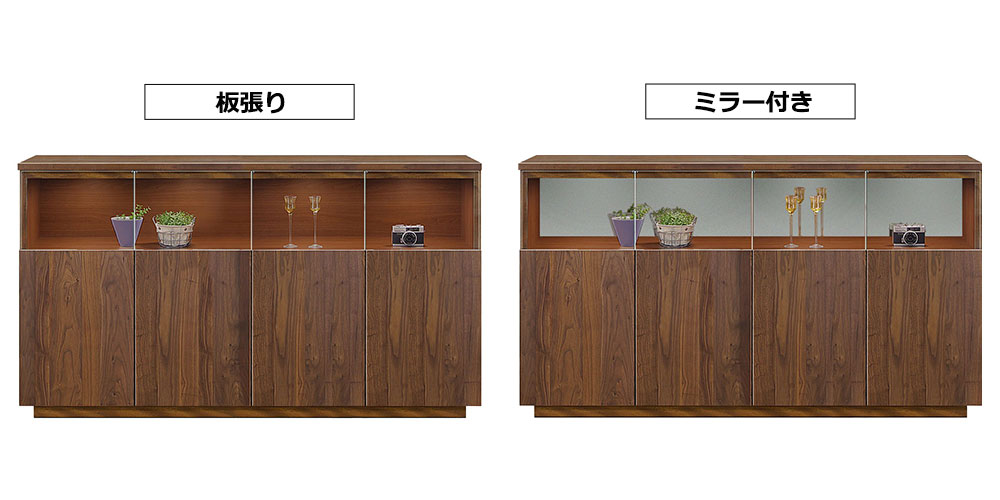 サイドボード「NEWイソラ」 幅160cm 全2色 ガラス部背面2タイプ(板張り/ミラー付き)