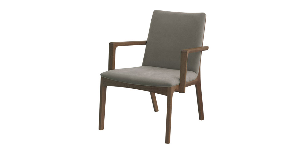 低めの高さ設定でリビングダイニング兼用のレイアウトが可能なNo.3000シリーズ。「寛ぐ」と「食事する」という2つの要素を満たしたリビングダイニングチェアの肘付きタイプです。汚れやキズに強い高機能張地「ディナミカ®」を使用しており、スウェード調のなめらかな肌触りが魅力です。