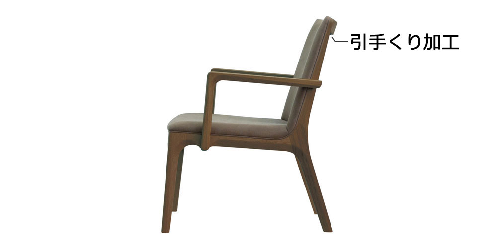 座のクッション材に布バネを使用しており、底付き感のない快適な座り心地です。背面上部の「引手くり加工」によりチェアの出し入れもスムーズです。