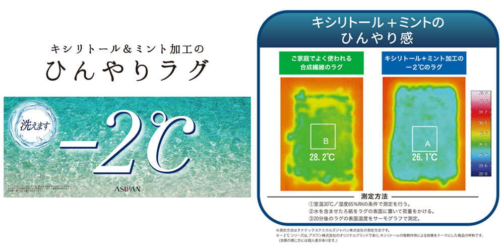 「-2℃シリーズ」は、汗などの水分に反応して涼感効果をもたらす天然成分のキシリトールと、涼感効果を持続する働きがあるミントをラグの表面に加工してあります。触れるとひんやり心地よく暑い季節を快適に過ごすのにぴったりのラグです。