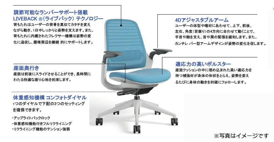 シリーズ1はユーザーの期待を越えるパフォーマンスの実現を念頭に設計されました。Steelcaseが誇る統合LiveBack®テクノロジー、適応力の高いボルスタリング、4Dアームを搭載し、身体をしっかり保持しながらダイナミックな動きを実現しました。