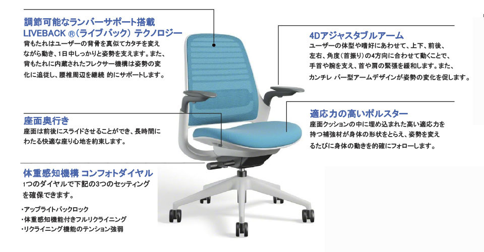シリーズ1はユーザーの期待を越えるパフォーマンスの実現を念頭に設計されました。Steelcaseが誇る統合LiveBack®テクノロジー、適応力の高いボルスタリング、4Dアームを搭載し、身体をしっかり保持しながらダイナミックな動きを実現しました。