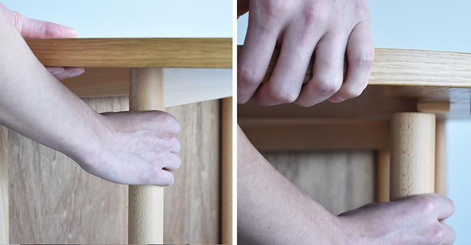 脚を内側にずらして、天板を下げるだけです。力もいらず、女性でもかんたんに操作できます。