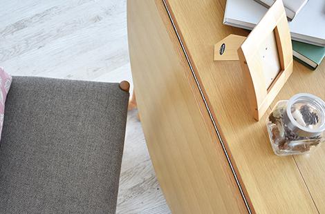 普段はオーバル(楕円)型のやさしい雰囲気のダイニングテーブル。両面たためば収納することもできます。