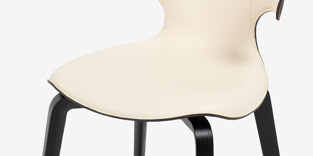 背もたれが左右に広がり、背中を支えるようなフィット感を生み出すデザインです。ボディはカーブさせた成型ブナ材の積層合板で形成されています。