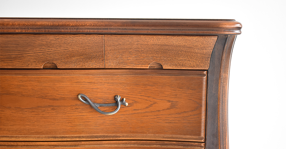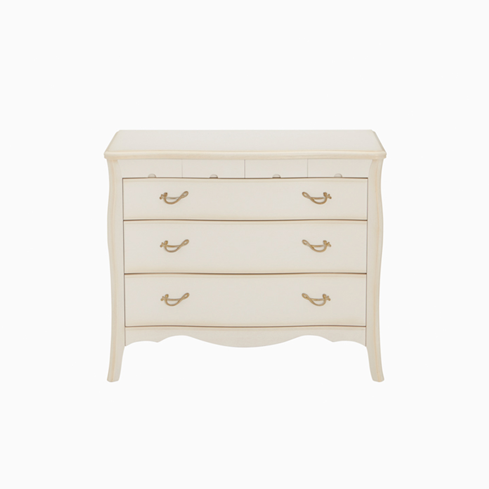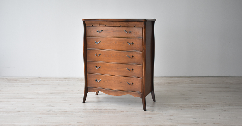ウェーブがかったフロントラインが美しい、クラッシックスタイルのエレガントなチェストです。ヨーロピアン・アンティークをイメージさせる華やかさと重厚感、繊細なディティールは見る人を一瞬で虜にしてしまう魅力があります。