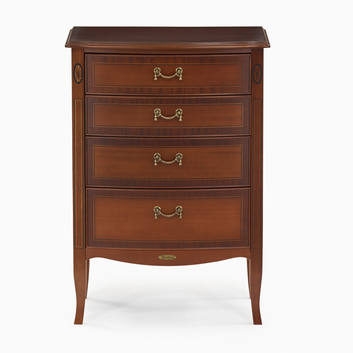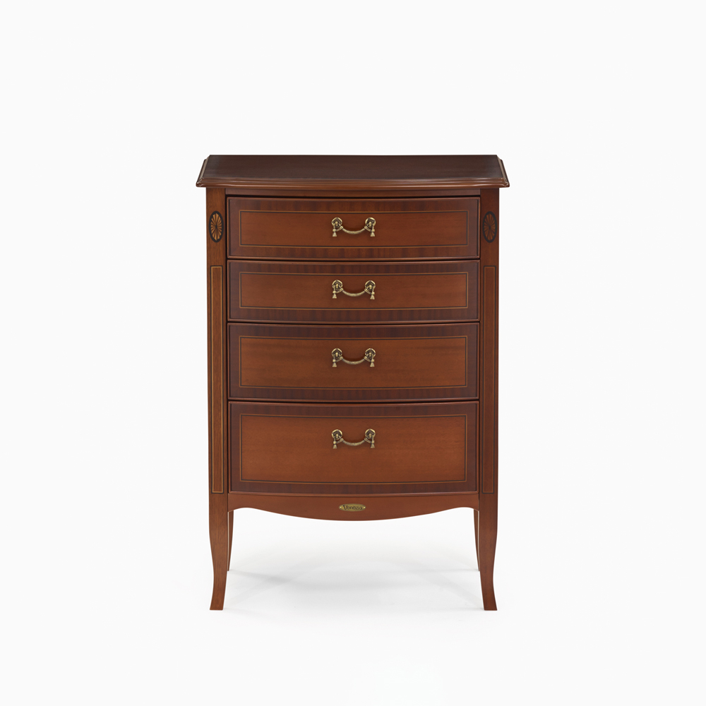 天板と前板の表面にサペリ柾目の模様貼りと、緩やかな曲線ラインが魅力のネオクラシック調のコンパクトなチェスト。