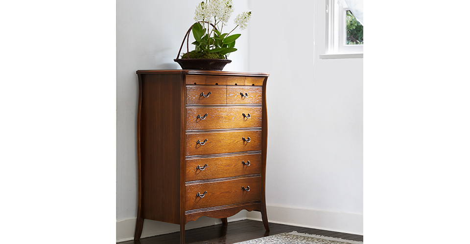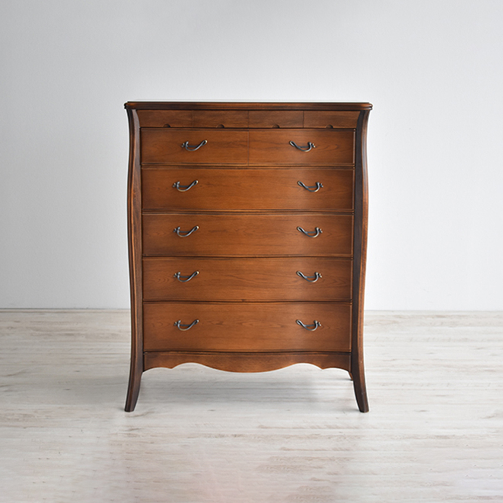 ウェーブがかったフロントラインが美しい、クラッシックスタイルのエレガントなチェストです。ヨーロピアン・アンティークをイメージさせる華やかさと重厚感、繊細なディティールは見る人を一瞬で虜にしてしまう魅力があります。