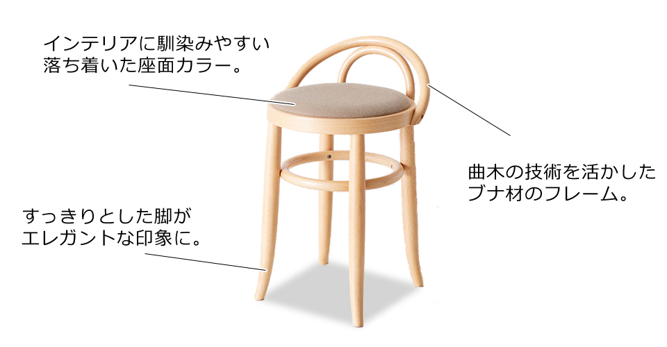 曲木の専門工房である秋田木工のカウンターチェアシリーズ。座面高は45cmはスツールとしてダイニングや玄関、ドレッサーと合わせてもお使いいただけます。ブナ材のやさしい質感が明るい印象です。