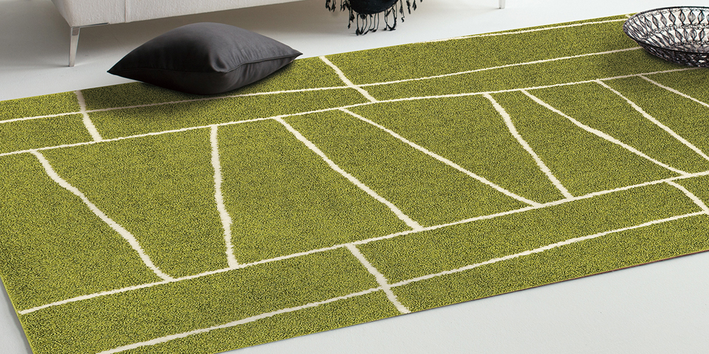 幾何学模様がお部屋のアクセントになるアクセントラグ「ジオーニ」。ナイロンのパイルは摩擦に強く、弾力性と耐久性があり遊び毛が出にくいため、お掃除も楽にできます。