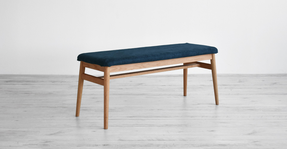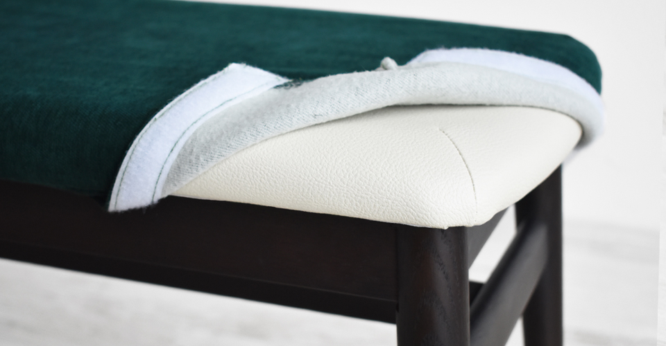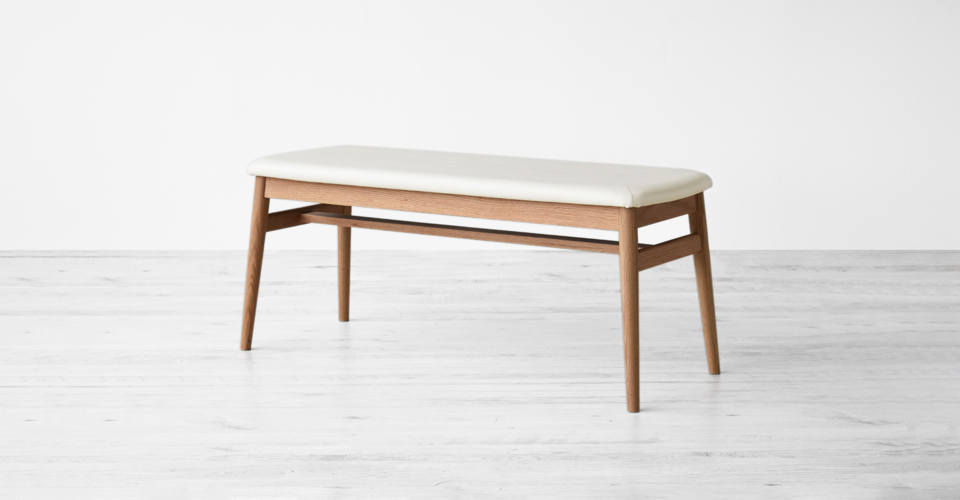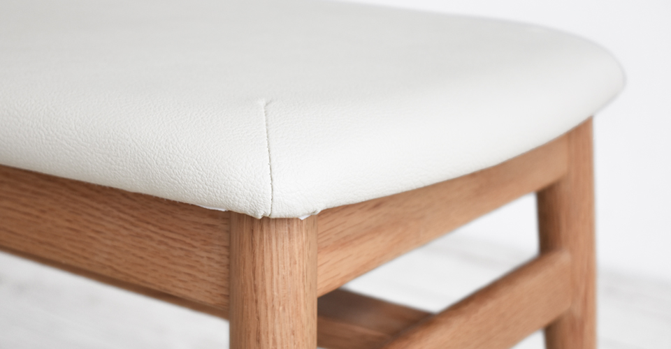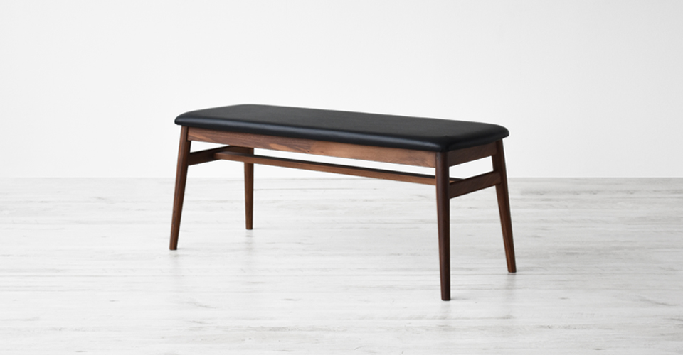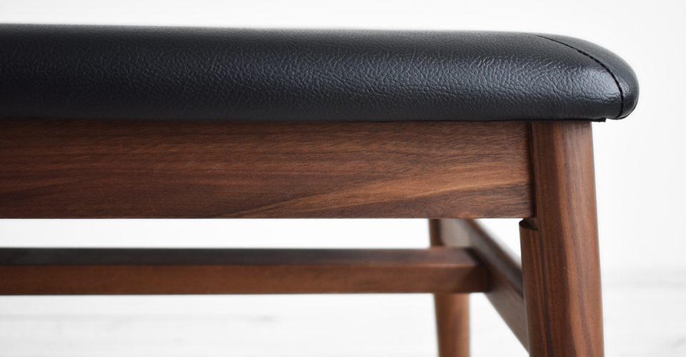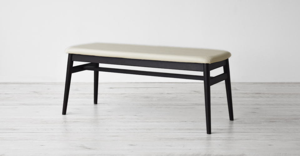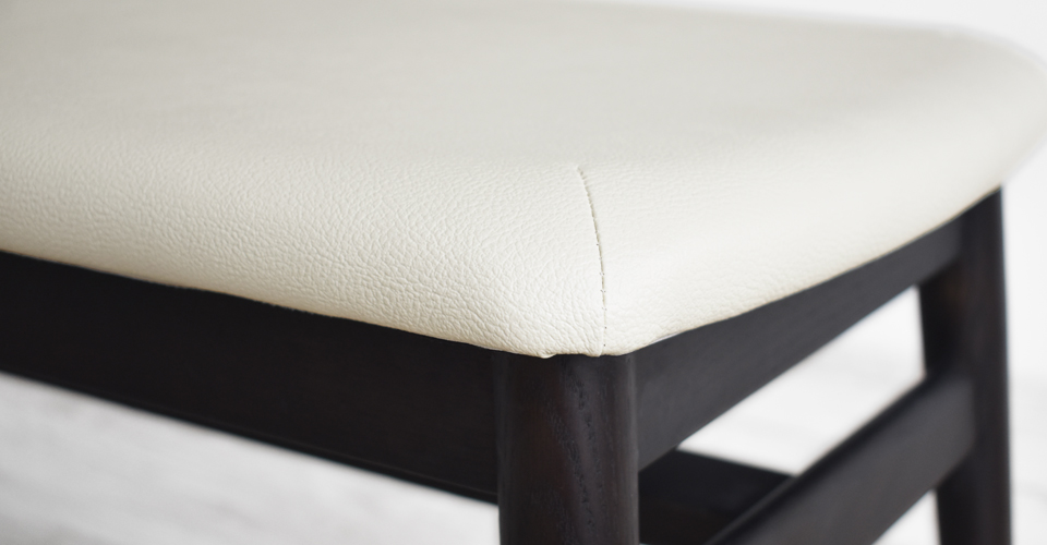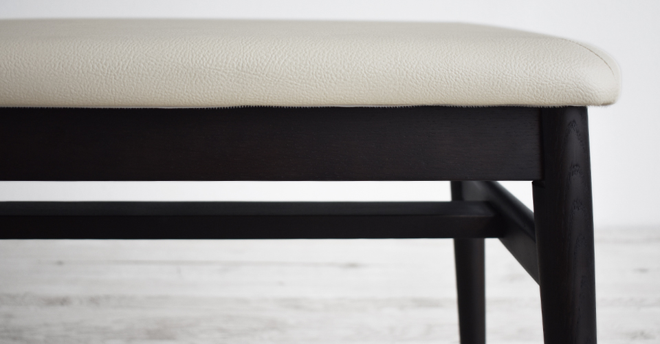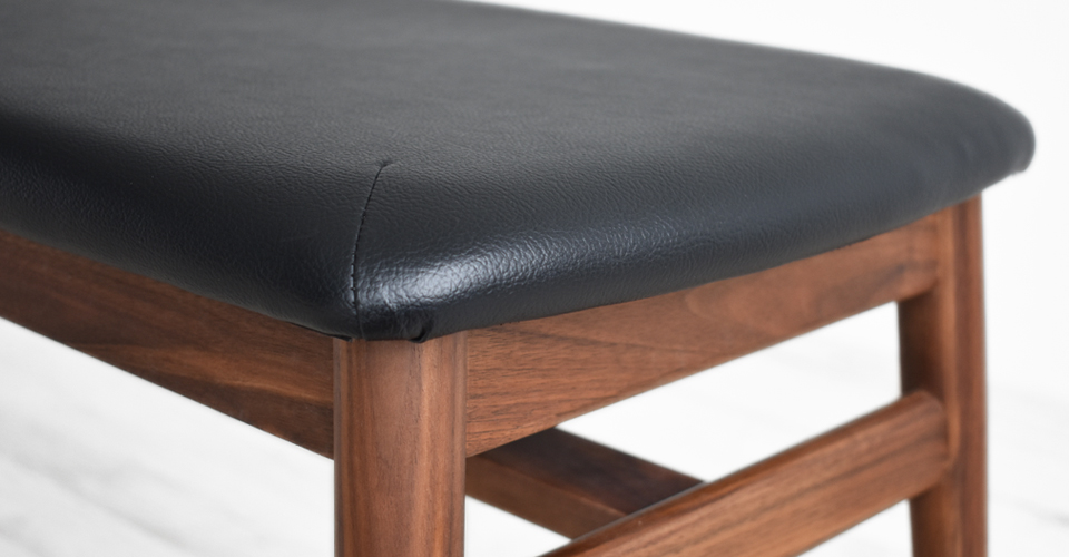 ウォールナット材の無垢材を使用した天然木のあたたかみを感じるカバーリングタイプのベンチです。座面はPVC素材のブラックとアイボリーの2色から選べ、オプションでPVCの座面の上に布カバーを取り付けることができます。