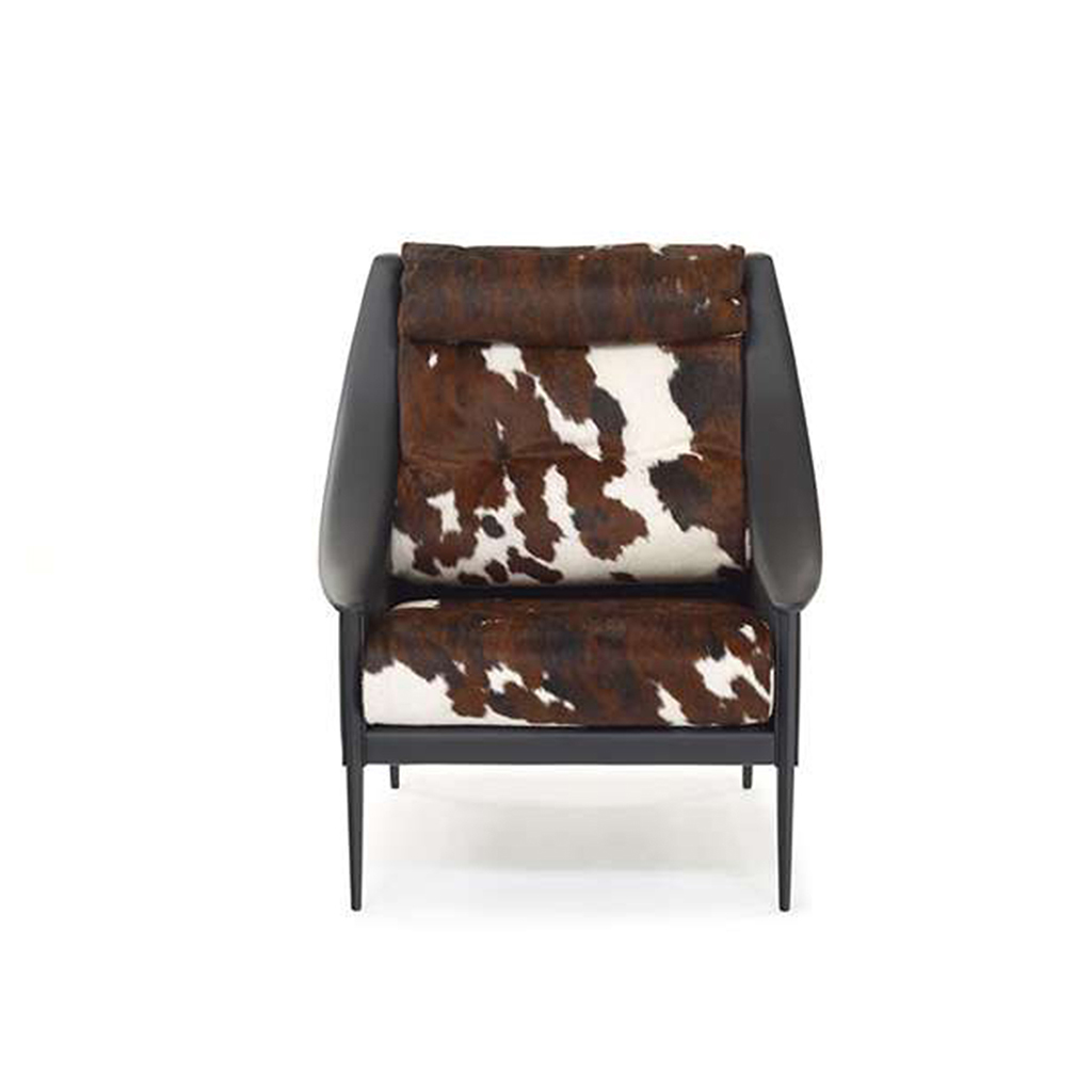1965年にデザインされ、理想的なモダンデザインとして今もなお人気のアームチェアです。 シンプルなフォルムですが、座と背に個性的な柄のカウスキンを大胆に用いることで、洗練された印象に仕上げています。 側面に打たれた鋲がアクセントとなりデザインを引き締めます。 ※画像はイメージです。カウスキンは自然のものを使用しておりますので、 模様は一点ごとに異なります。