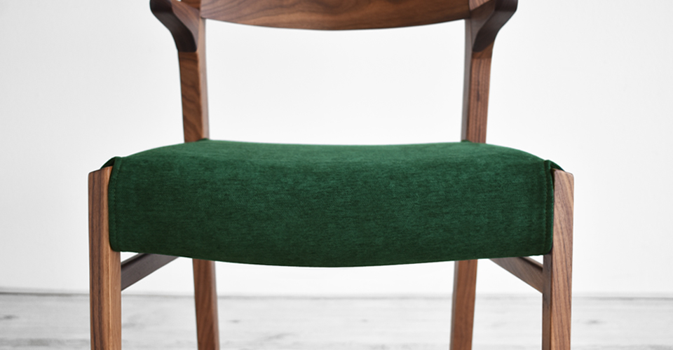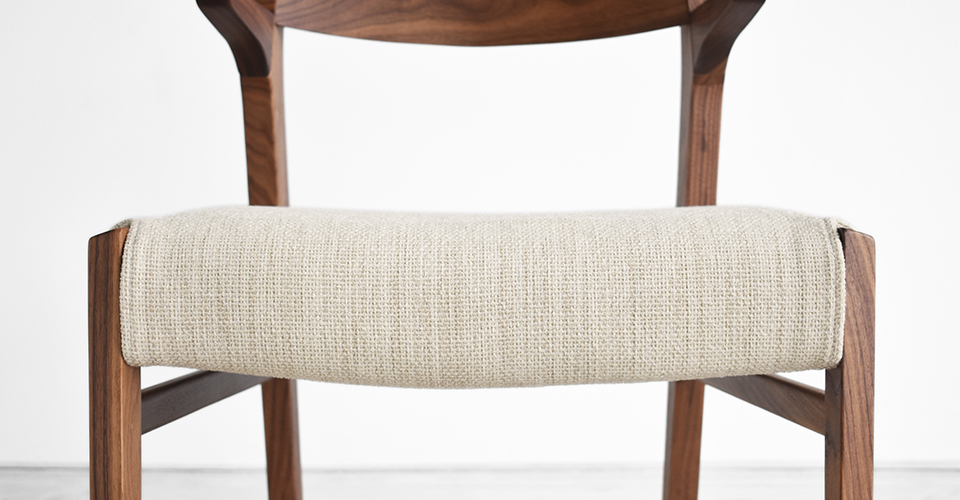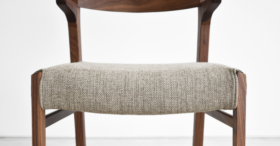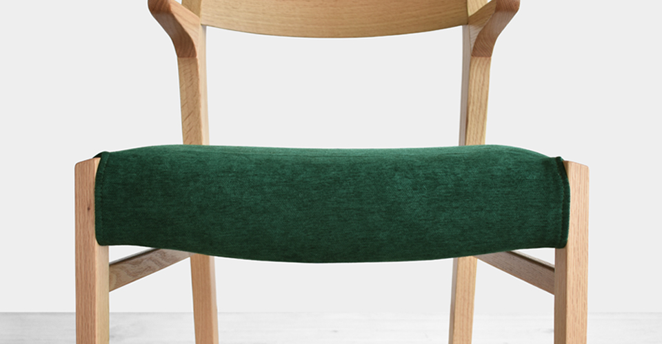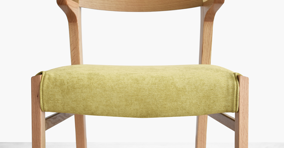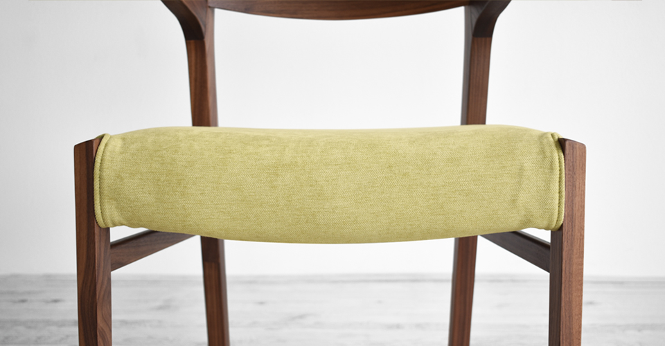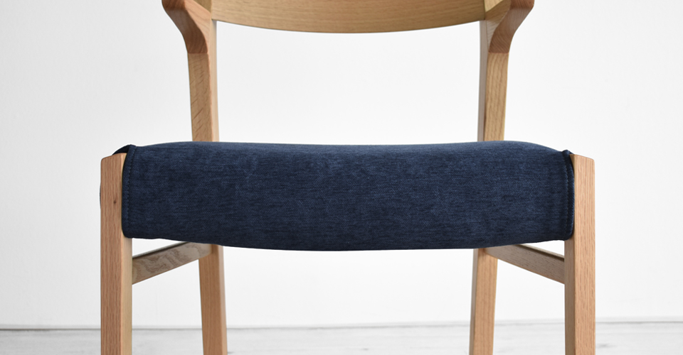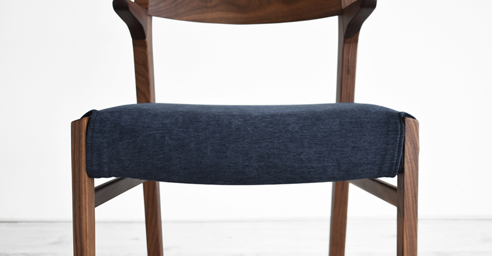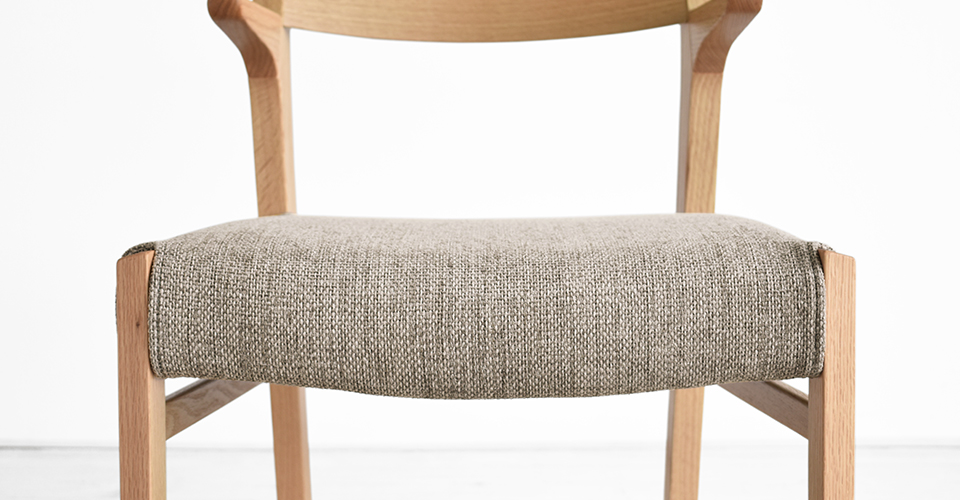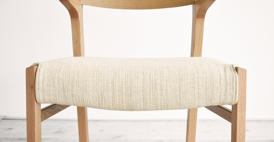天然木の質感を活かしたシャープなラインをベースに、丸みを持たせた脚部がバランスのよい椅子「シネマ 半肘付」専用のファブリックカバー。