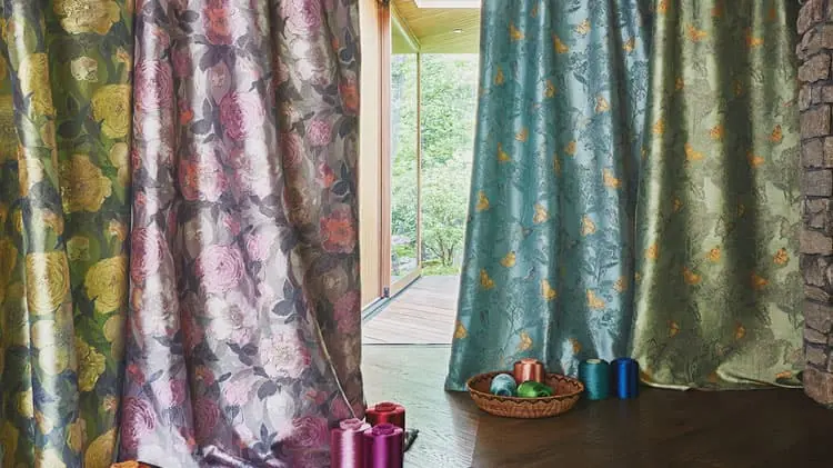 様々な薔薇が寄り添い揺れ、たなびくように構成しました。たっぷりとしたふくらみのある幾重にも花弁が重なった薔薇の花を、刺繍のように緻密で入り組んだ、変化に富んだヨコ糸組織で表現しています。空気や水の流れの揺らぎを背景にデザインしています。(画像はSH9772+SH9773)