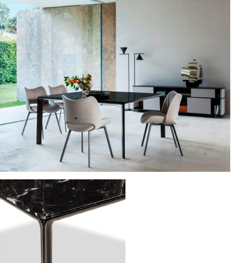 天板には大理⽯を使⽤し、彫刻のような美しいディテールで、シンプルな中に繊細な美学が宿る、ガムフラテージらしいデザインのダイニングテーブル。