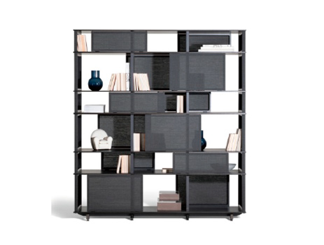 デザイナーのジャン・マリー・マッソーがスピーカーから着想を得てデザインしたキャビネット。ライトカラーとダークカラーの半透明なパネルを組み合わせることで、軽快な印象を与えます。細部にまでこだわった、デザイナーの遊び⼼を感じさせます。