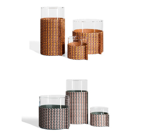 Pelle Frau®レザーを使⽤したフラワーベースから、レザーの表面にデジタルプリントを施した「Motif Weavers」シリーズが新たに登場。2つのカラーバリエーションを展開し、セージはグリーン、ブラウン、ブルー系の構成でクールに、シナモンは絡み合ったモチーフをあたたかみのあるカラーリングで表現しています。