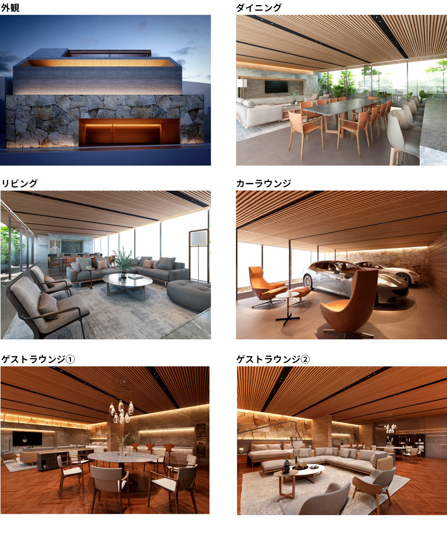 室内は、都会にいながら四季の移ろいを感じることができる、大きな窓を備えた開放感のあるリビングや、非日常を演出する高級感溢れるアウトドアラウンジ、そして最上級のおもてなしで迎えられるゲストラウンジ、さらには自然光を効果的に取り込み、ミュージアムのようなアーティスティックな雰囲気を醸し出すカーラウンジなど、五感のすべてが響く場となります。