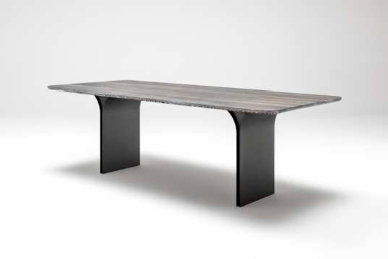 縞模様のテーブルトップがまるで浮かんでいるようなデザインのダイニングテーブル「990」。存在感が際⽴つ天板とシャープな脚部との対⽐が魅⼒。天板は8種の上質な無垢材・サイズは6種から選択可能で、空間に合わせてフレキシブルにオーダーいただけます。
