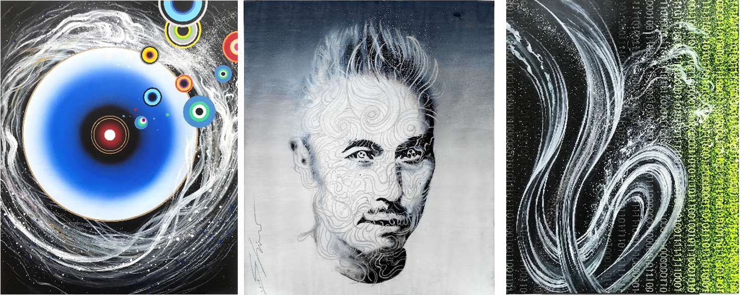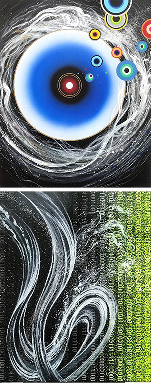 コンセプトは、⼈間、地球、宇宙に存在するアニミズム的エネルギーと、最近⼈類が発⾒した世界共通のデジタルエネルギー「0と1」であります。幼少期に⾃然に囲まれた⽇本の深い⼭奥で暮らし、⻘年期にはコンピューターエンジニアとして「0と1の世界」を究極に追求した結果、心身にストレスを抱え、リタイアしました。その際、デジタルエネルギーが持つ光と闇の両極を経験しています。デジタルがもたらす狂気的なスピードの変化が多くの⼈々の魂を傷つけている現代において、「魂とデジタル、個⼈と世界システム、⽣と死、聖と俗、⾃然と文化」といったコントラストを、東洋的な精神性をもって描き続けています。