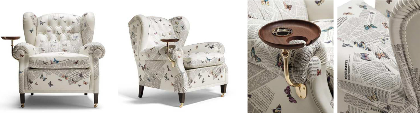 本モデルでは、フォルナセッティのモチーフ「Ultime Notizie」をプリントしたPelle Frau®レザーを採用。新聞の断片を思わせるグラフィックの中に蝶が舞う印象的なデザインが、アイコニックなアームチェアをアートピースのような存在感へと昇華しています。