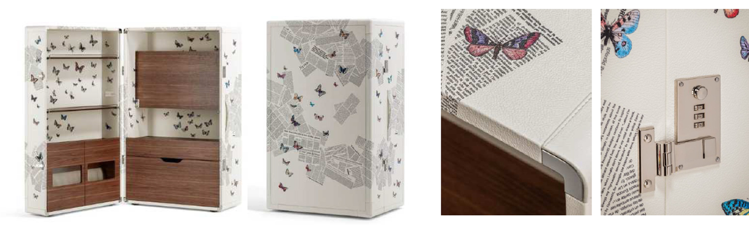 「Isidoro Ultime Notizie」は、フォルナセッティのモチーフ「Ultime Notizie」をプリントしたモデル。新聞の断片を思わせるグラフィックの中に蝶が舞う幻想的なデザインが広がり、独創的な美しさを備えたキャビネットとして、空間に特別な個性をもたらします。