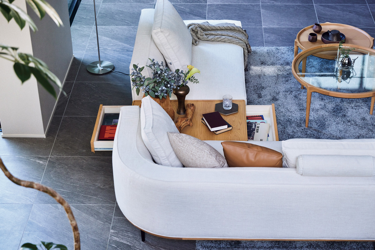 引出し付きのサイドテーブルと一体化したユニークなデザインのソファです。良質なオーク無垢材を使った台輪は、長年の使用に耐えうるしっかりとした厚みがありながら、角部分を面取り加工することで本来の厚みを感じさせないデザインです。