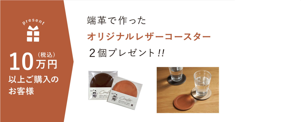 浜本工芸の製品を税込10万円以上のご成約で、製品の製造過程で出てしまう端材を有効に利用して作成した、レザーコースターをプレゼント!