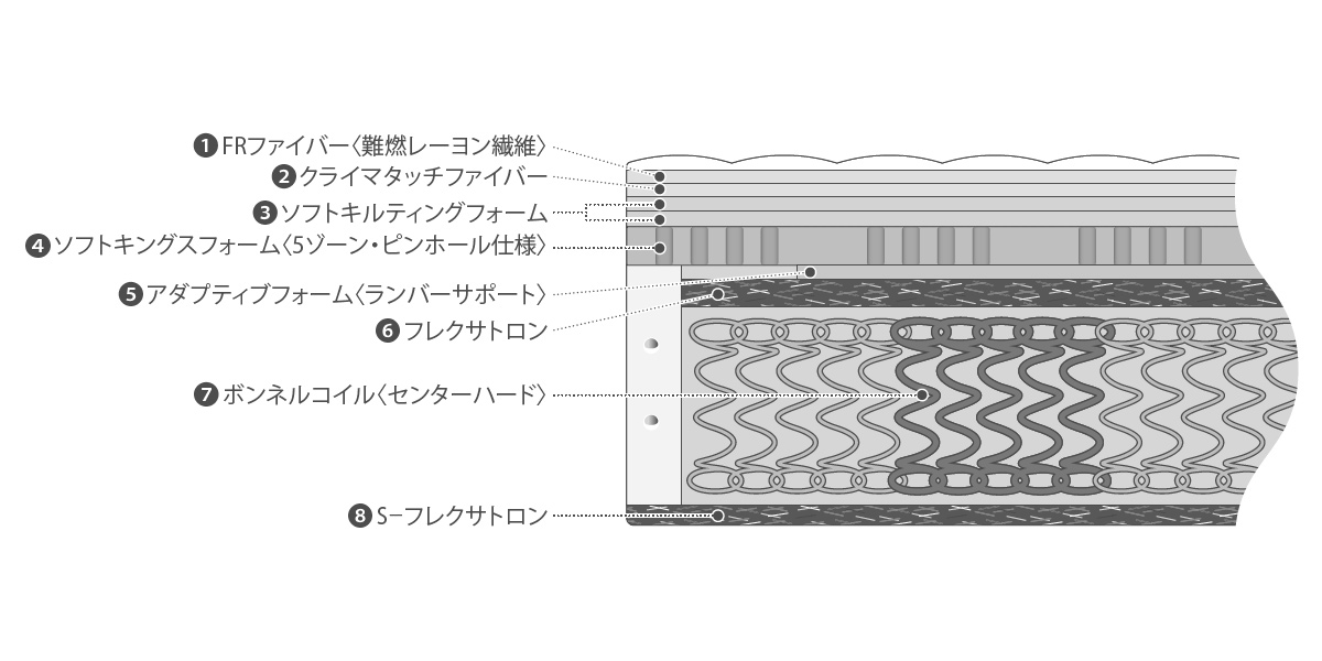 型崩れしやすいマットレス外周には太線径や小口径のポケットコイルを配置。耐久性を高めるとともに、マットレス全面を快適に使えるよう設計しています。