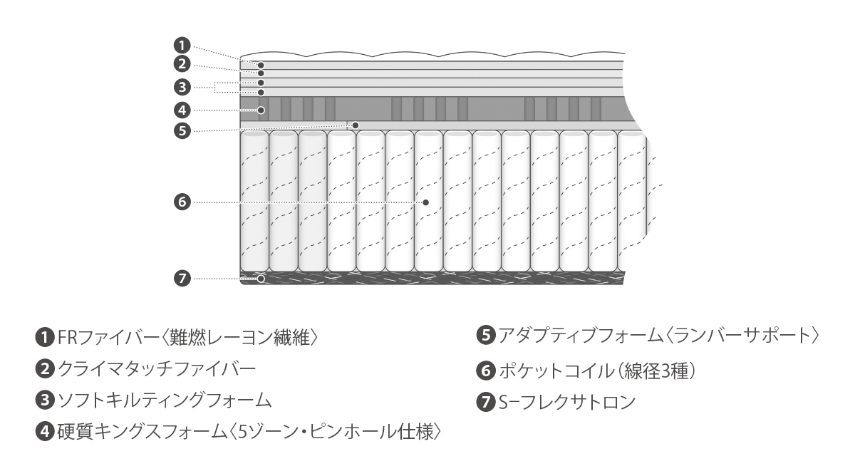 型崩れしやすいマットレス外周には太線径や小口径のポケットコイルを配置。耐久性を高めるとともに、マットレス全面を快適に使えるよう設計しています。