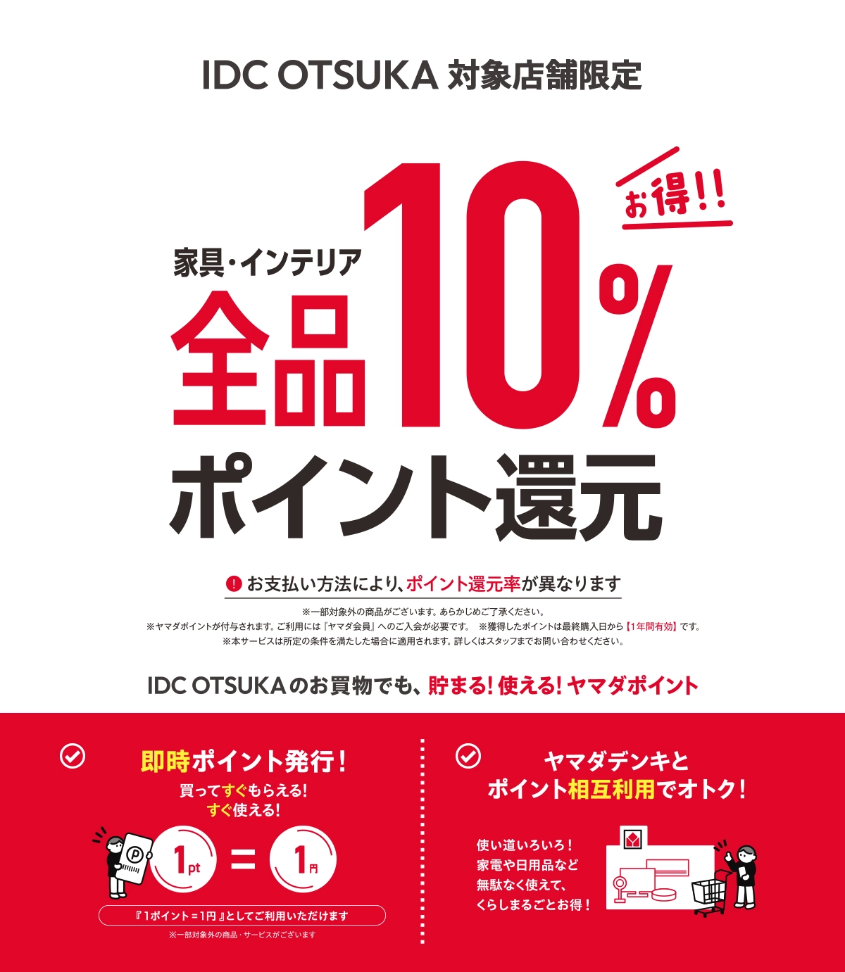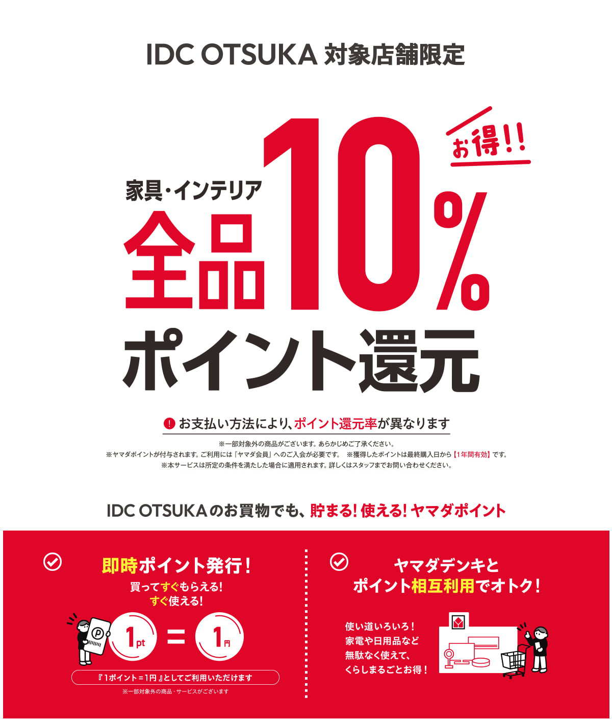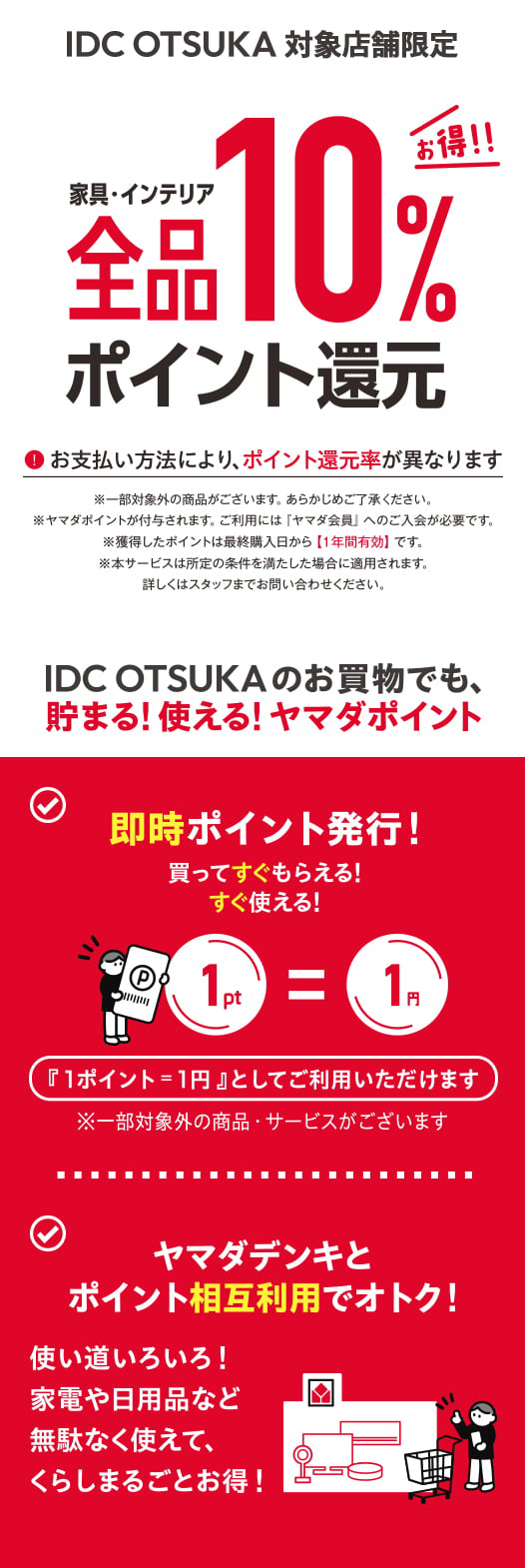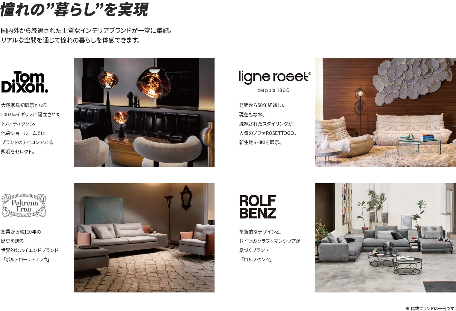 - ホテルライクなスタイリッシュな空間を日常に。イタリアやドイツをはじめ、欧米を代表する人気ブランドの洗練されたインテリアからコストパフォーマンス&デザインに優れたIDC OTSUKAオリジナル家具まで。憧れの暮らしを叶えるインテリアが揃う専門フロアです。
