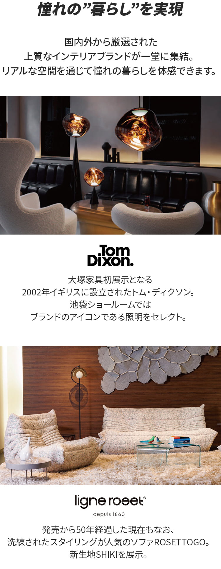 - 世界のエグゼクティブを魅了するインテリアブランドが揃う専門フロア唯一無二のデザイン、妥協を許さないクオリティ。 大塚家具だから出会える、時を超えて愛される名品の数々。その魅力を存分にご体感いただけます。