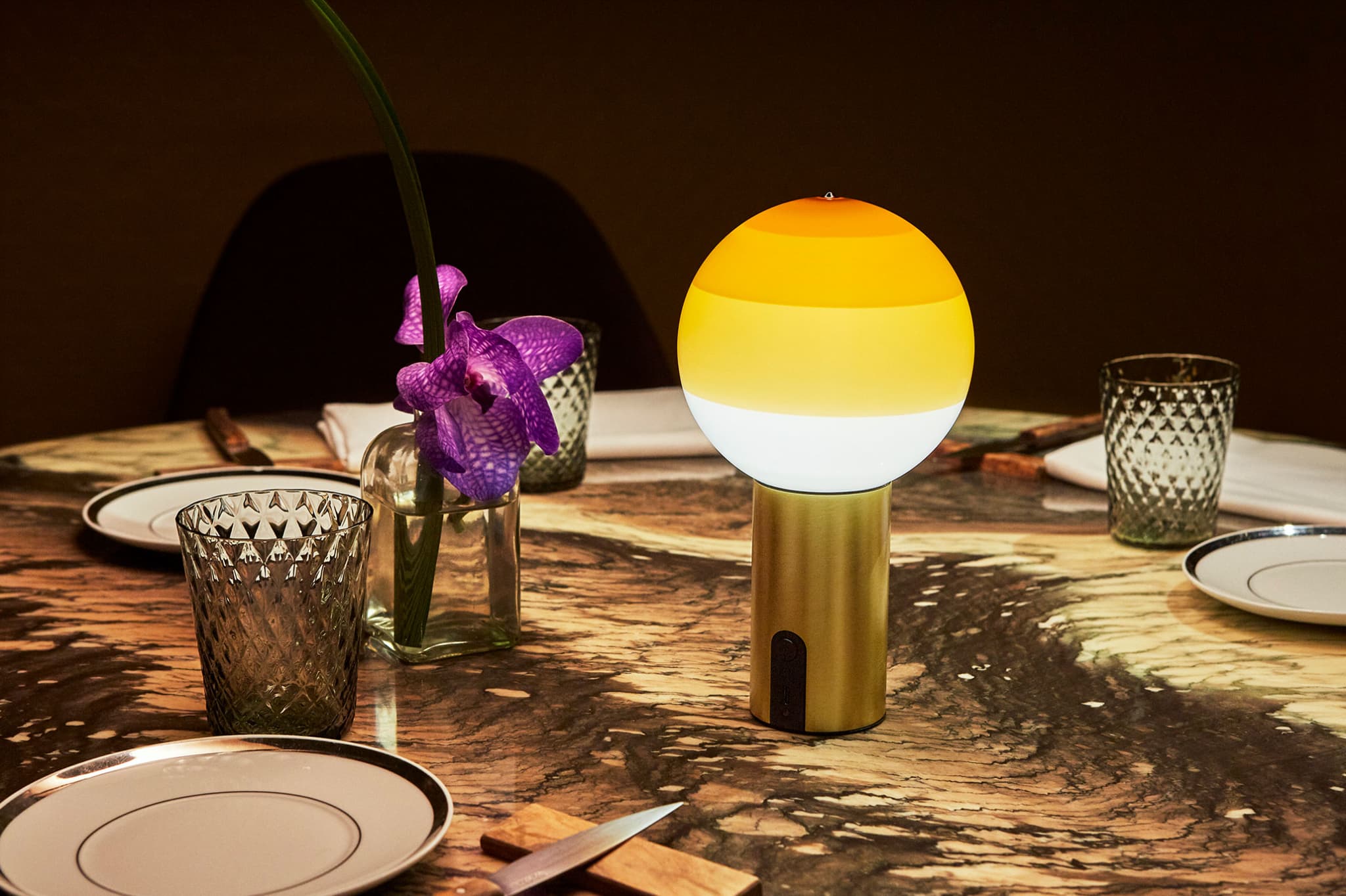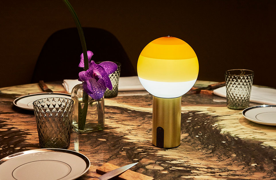 乳白ガラスのセードを塗料に浸してグラデーション模様を施したこのテーブルスタンドは、光の錬金術師と呼ばれるデザイナーのジェルディ・カヌダスが手掛けました。点灯すると、さまざまな色合いのペイントが光を揺らめかせ、幻想的な灯りを生み出します。