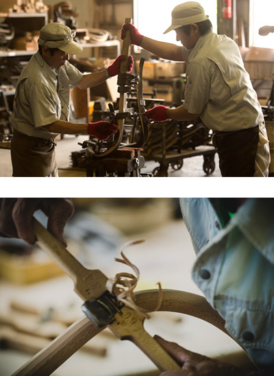 職人の手作業によってひとつひとつ丁寧に木を曲げつくられた
