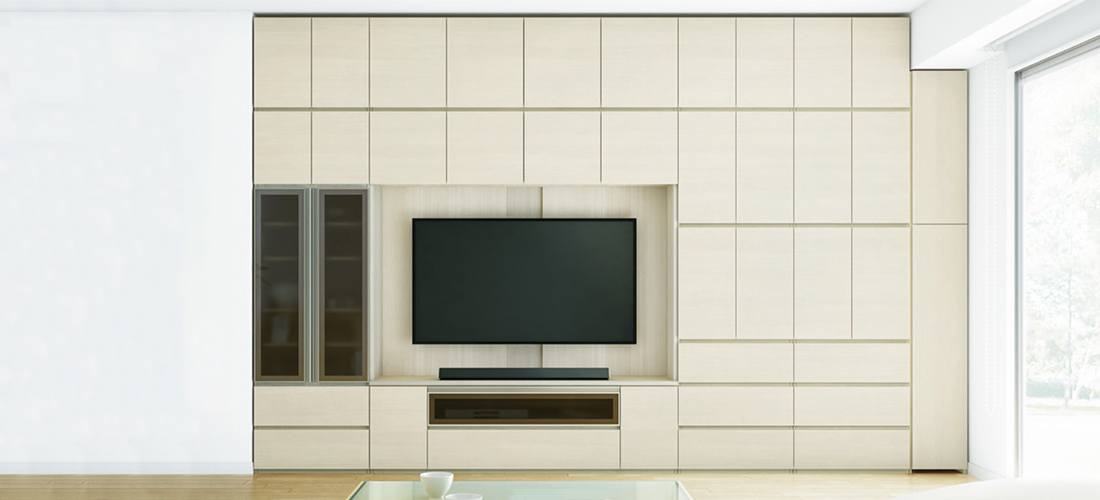 お部屋の壁の大きさに合わせてオーダーできる「壁面収納」。テレビボード・リビングボード・キャビネットを一つにまとめることができる為、木目や色味を揃えることができ、お部屋に統一感を持たせることができます。