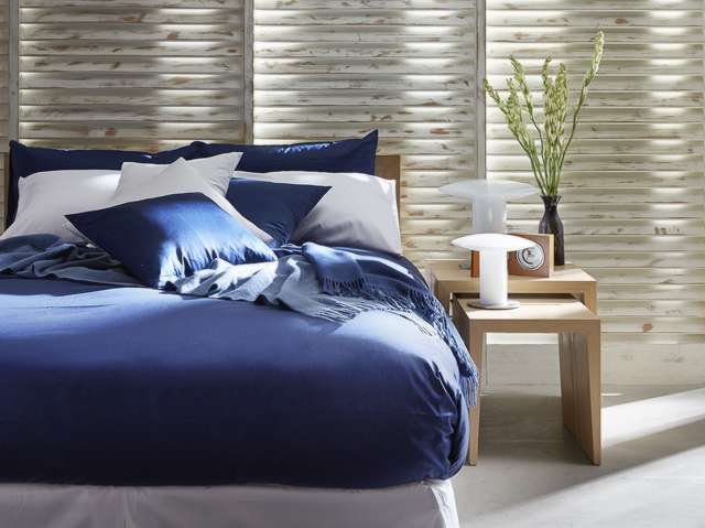 例えばウッディーなベッドフレームとネイビーブルーのシーツのコーディネートは、シックで落ち着いた寝室を演出できて素敵だと思います。