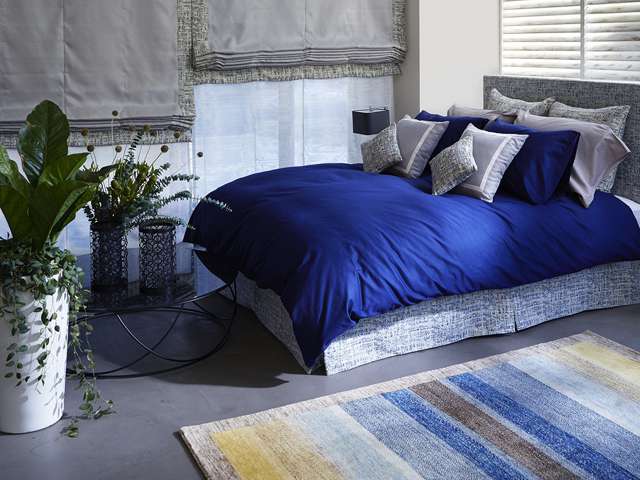さらに、カバー類と同じブルーが入ったラグを加えると、寝室コーディネートにまとまり感が出て美しいですね。カーテンやクッション、枕などはグレーなどのひかえめな色にすれば、全体が落ち着いた雰囲気になります。さらに、大きめの植物を置いてあげると、より洗練された印象になりますね。