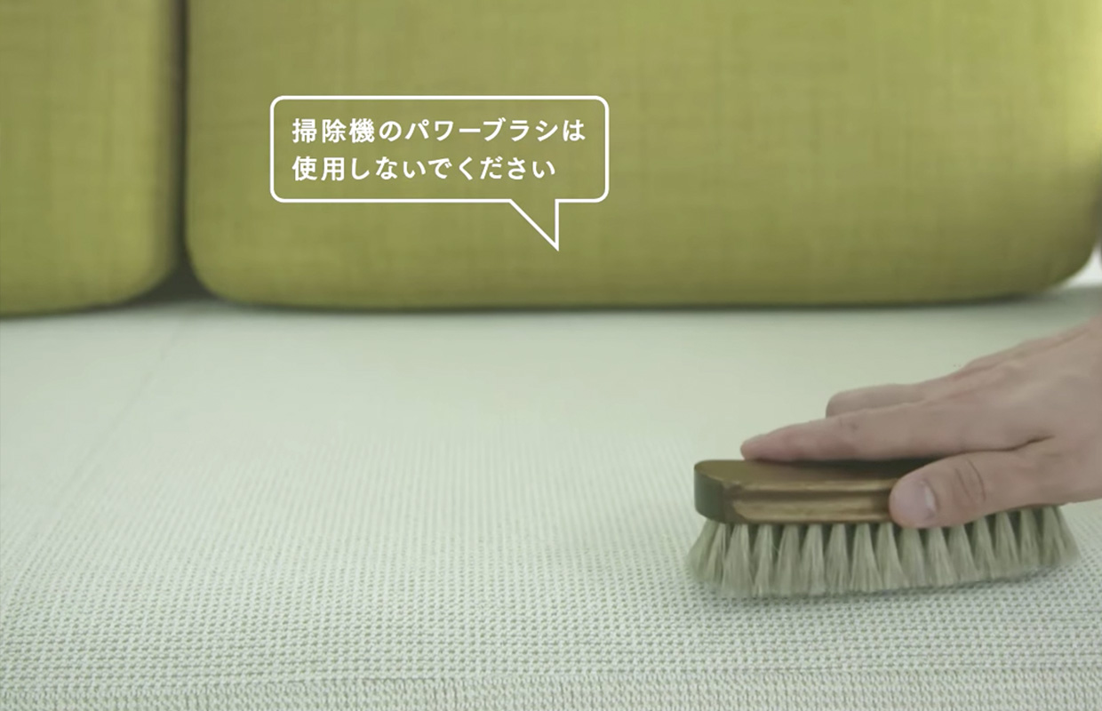 日頃のお手入れは、定期的に掃除機でホコリを吸い取るか、柔らかいブラシでブラッシングしてください。汚れが付いたら、すぐに拭き取ってください。時間の経過とともに生地に汚れが浸透して取れにくくなります。