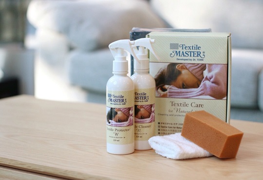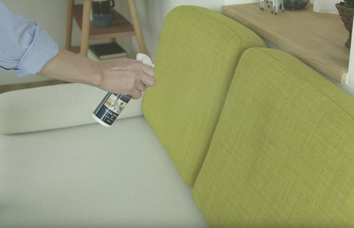 布製のバッグや靴を購入した時、使用前に「防水スプレー」を吹き付けたことはありませんか? ソファもそれと同じように汚れにくく、また、汚れが付いた場合も落としやすくしてあげましょう。そこで、ソファが届いたら、最初にやっていただきたいのが、「テキスタイルプロテクター」をスプレーすること。水や汚れを弾いて、キレイな状態を長く保ってくれる優れものです。
