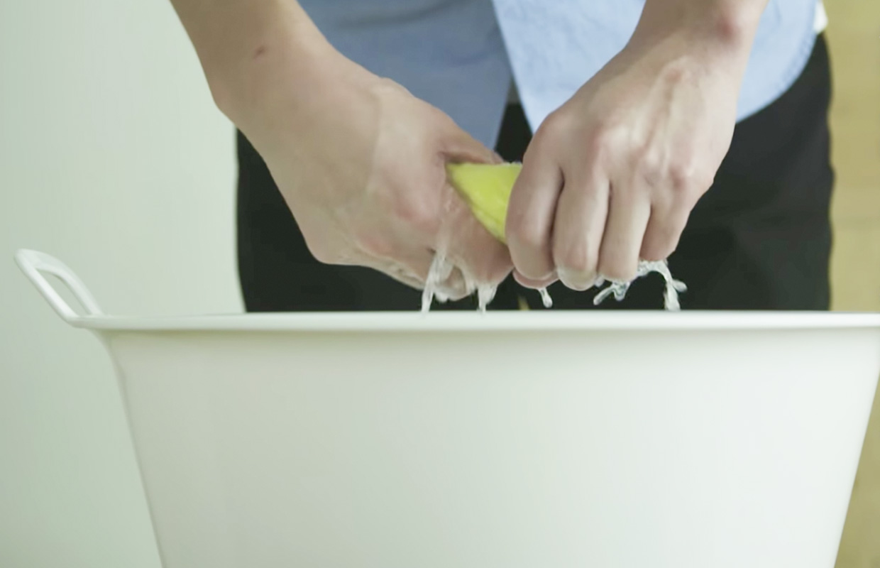 ②お湯に浸して固く絞ったタオルやクリーニンググローブで拭き取り・ゆすぎを繰り返します。拭き残しは輪ジミの原因になるので要注意。