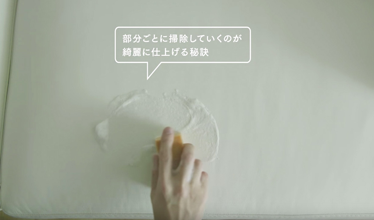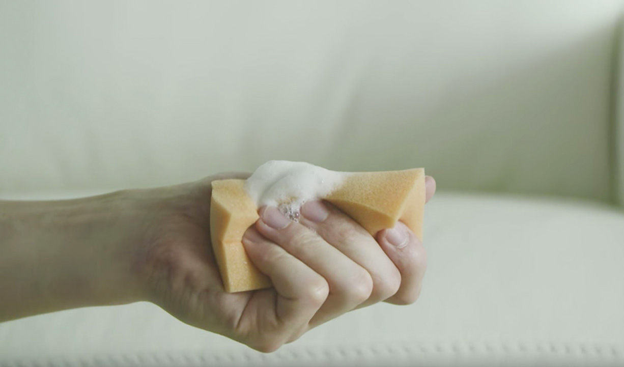 ②レザークリーナーをスポンジに含ませ、泡立てます。洗顔する時のようにやさしくスポンジを動かしていきます。