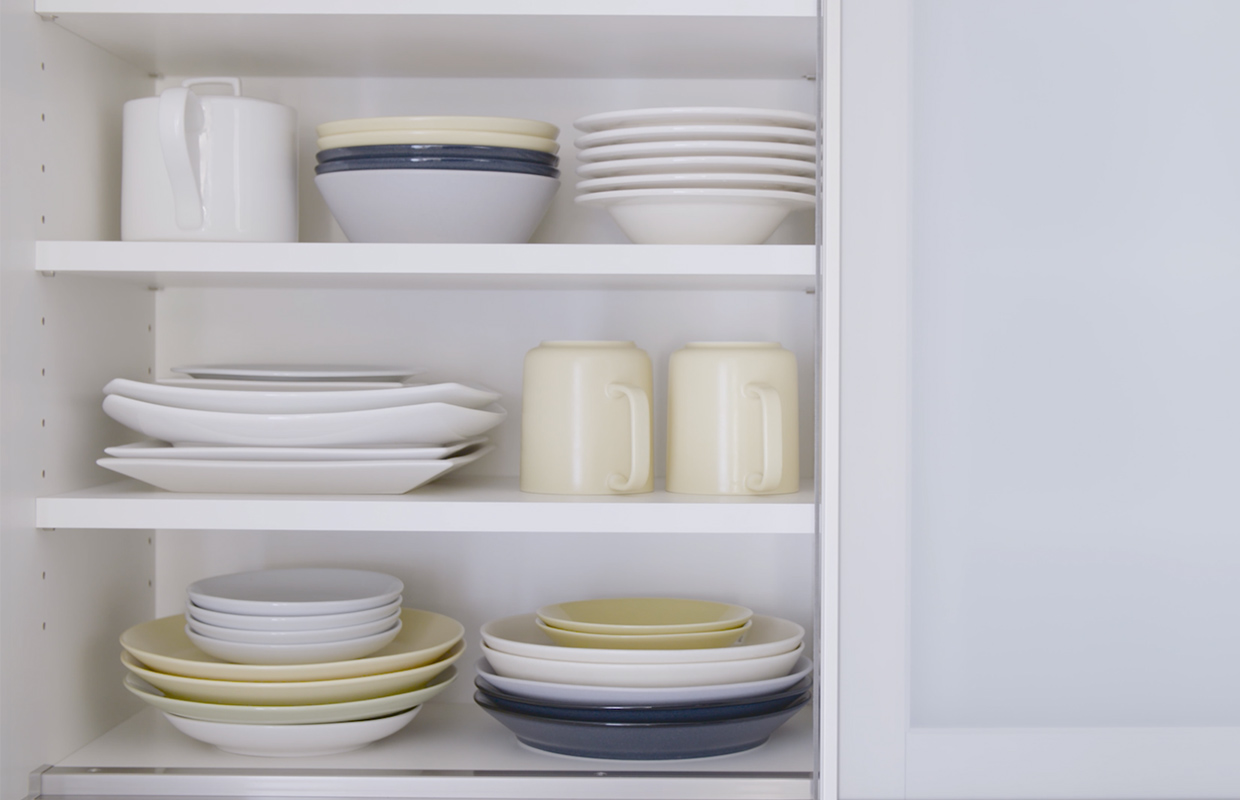 収納家具を安定させるためには、いちばん下の引き出しに、重たいものをおくようにしましょう。中心部や上部の棚に重たいものをおくと、バランスが悪くなるためです。食器棚であれば、ストック用のペットボトルや大きめのお鍋を置くことで「低重心」を保てます。家具に耐震ラッチなどの災害対策器具がついているものを選ぶとより安心です。また、上の戸棚に食器をしまうとき、整然と食器の大きさに分けてしまうことが多いですが、災害対策をより考えるのであれば、食器を重ねるときは、下から中皿→大皿→小皿の順に重ねることで、揺れが起きた時の食器の滑り出しを防ぎます。これは、意外と知られていないポイントですよね。ぜひ試してみてください。