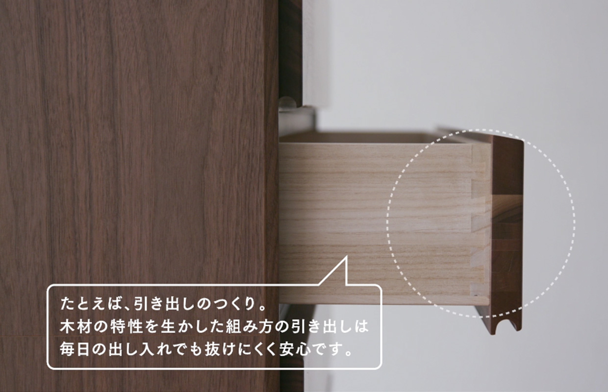 良いタンスの条件は「つくり」。重要な目利きポイントです。 どれも同じ引出しのように見えますが、さまざまな違いがあります。