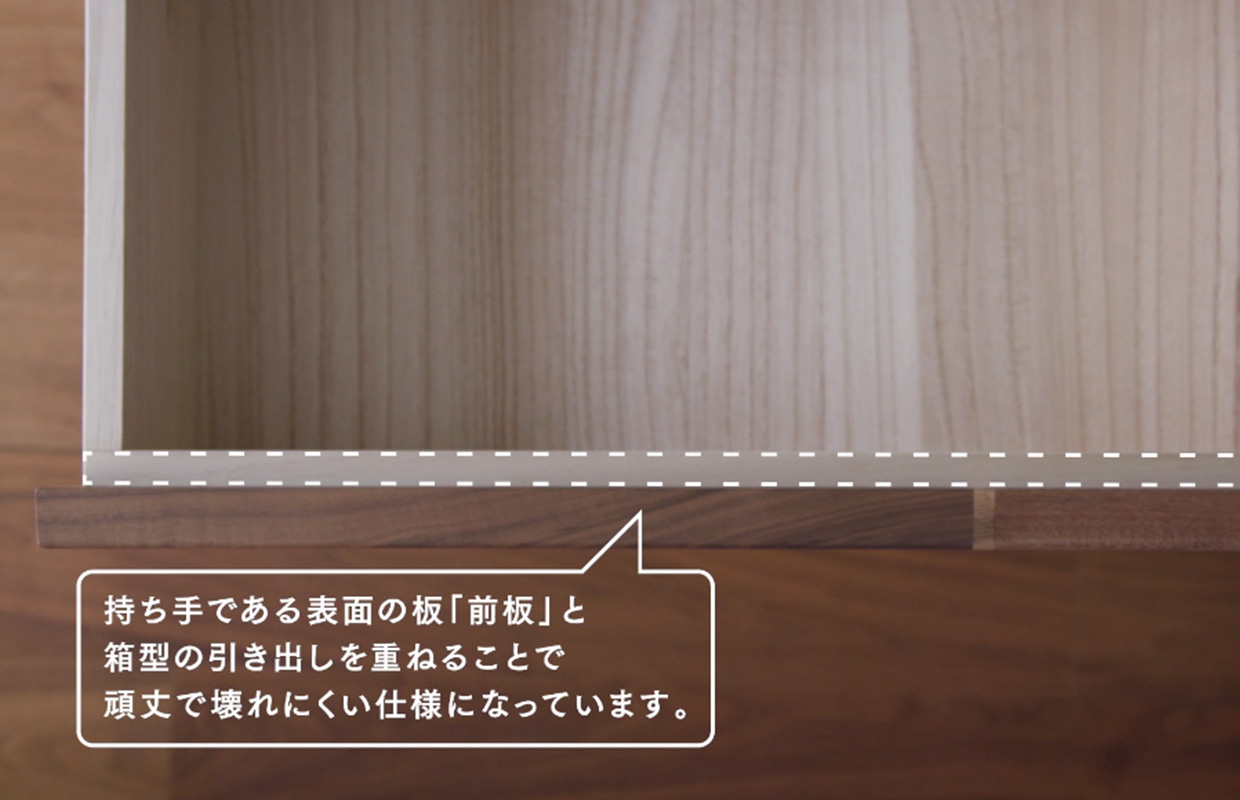 まずは引出しを開けて構造を見てみましょう。「箱に直接取っ手を付けた引出し」と、「箱の上にさらに前板を付けた引出し」があります。この2つを比べると、後者のほうが強度があります。前者の場合、引出しを引っ張るときに前板ごと力が掛ってしまうため、どうしても箱が歪んできてしまいます。