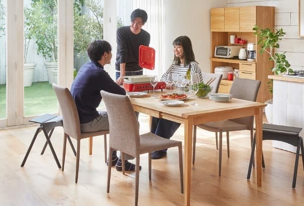ダイニングテーブルは伸長式のものを設置することで、使わない時はコンパクトに、食事の時は広々と利用することが可能です。また、来客時にも対応できるので、自宅に人を招く機会が多い方にもピッタリ。