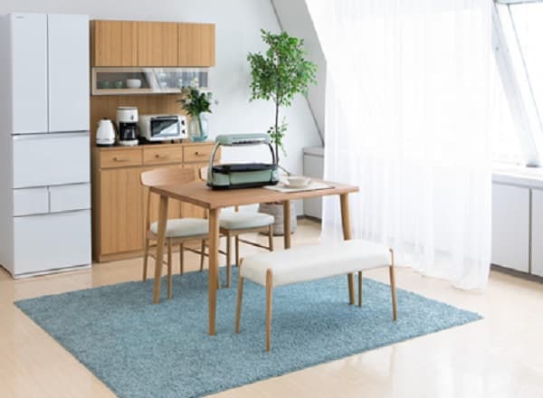 ダイニングキッチンには2人用のダイニングテーブルを設置するのもいいですが、昇降式のダイニングテーブルを活用して、リビングダイニング兼用にすることで、家具の数が減り、お部屋を広くお使いいただけます。