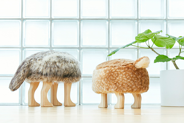 動物の身体のようなクッションと脚が大きなインパクトを与えるスツール。尻尾もワンポイントです。白とグレーが絶妙ブレンドされており、北欧風の玄関に馴染みます。ふんわりとした座り心地で、ブーツや革靴を履く時の腰掛けに便利。2サイズ展開されているので、子ども用と大人用で揃えるのも良いですね。